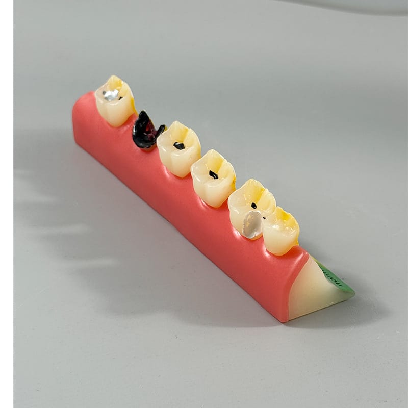 This educational dental caries model clearly illustrates the progressive stages of tooth decay (caries), from healthy teeth to severe destruction, including the impact on permanent tooth replacement. Ideal for pediatric dentists, clinics, schools, and patient consultations to demonstrate why early prevention is crucial, especially in children.